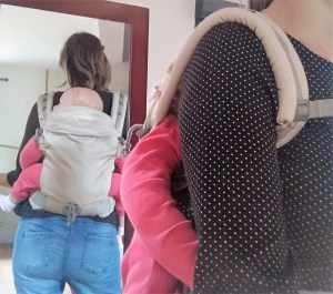 - Alors pour l’installation en réglage nouveau né, petit bémol pour moi qui suis pourtant relativement habituée à la fameuse sangle dans le dos qui maintient les bretelles…ici très difficile à atteindre et a faire coulisser du fait du réglage et du serrage des bretelles…même en la desserant au maximum et en essayant de l’enfiler par l’avant, la tâche reste très laborieuse quand on est seul.
